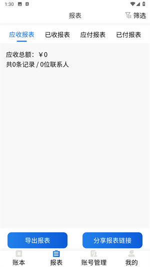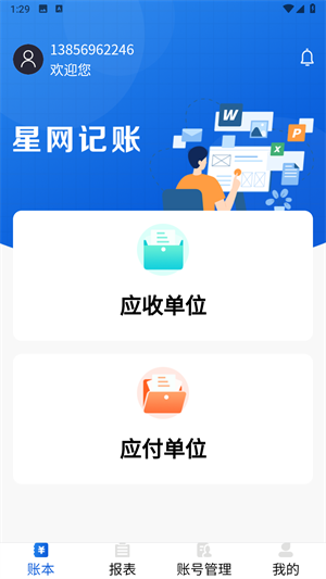 1、打开星网记账app,进入首页账本,里面包含应收单位和应付单位。
