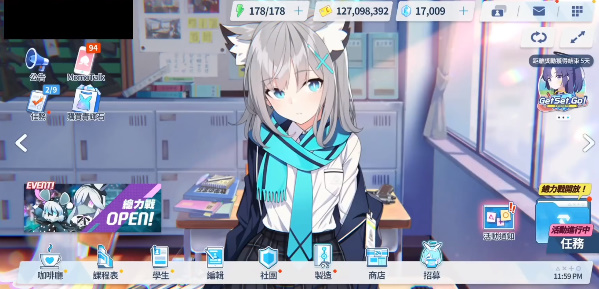 角色养成:角色的养成包括提升等级和使用装备强化,需要使用经验书和金币等资源。此外,与角色在咖啡厅互动可以提升好感度,解锁专属剧情和Live2D动画。