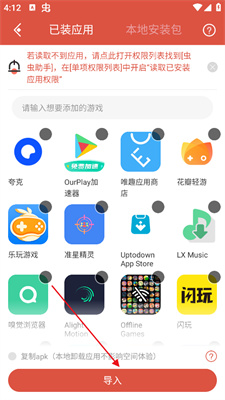 2、给需要添加的游戏或应用打勾并选择【导入】。