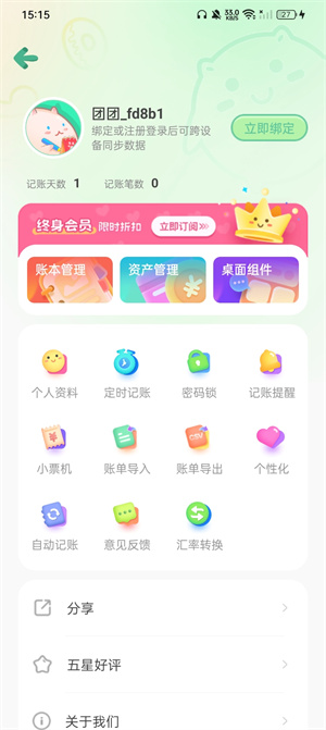 4、通知提醒:设置定时提醒功能,帮助你养成每日记账的好习惯,同时也可作为日常互动的一部分,比如提醒用户给团团喂食。
