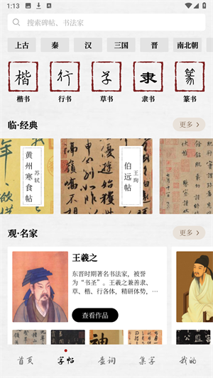 2、搜索书法:内置强大的搜索功能,只需在搜索栏中输入关键字词,即可快速找到相关的书法资源。