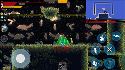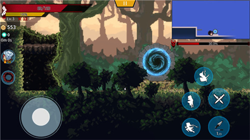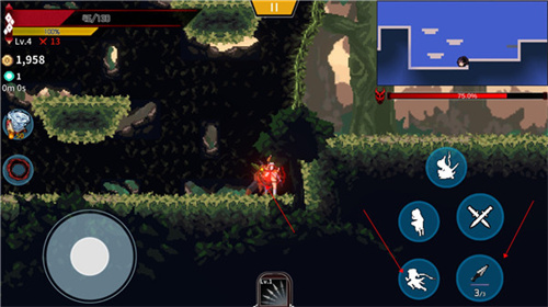 1、游戏采用横版动作的玩法,通过虚拟摇杆控制角色移动,右侧动作键负责攻击跳跃等操作;