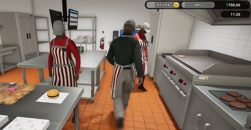 4、玩家需要将肉饼放置到烤盘上进行烤制,肉饼需要在烤制一段时间后进行翻面保证两面都烤熟,随后将肉饼放入汉堡胚中并进行包装;
