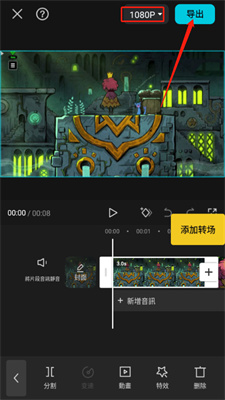 4、然后就进入剪辑界面啦,你可以进行转场,文字添加分段剪辑,添加效果等等,