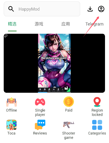 1、首先你需要登录最新版本的happymod客户端,然后打开应用点击右上角的【我的】。