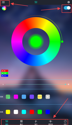 2、创新的音乐律动感应模式,通过音频分析技术使灯光实时跟音乐节奏自动变换色彩强度与明暗效果。