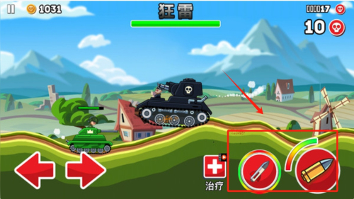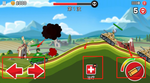 1、熟悉基本控制,玩家通过点击屏幕左右按钮控制坦克的前进、后退和转向,同时点击射击按钮进行攻击。