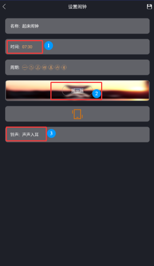 2、根据自己需求设置时间,铃声,震动模式。