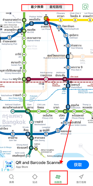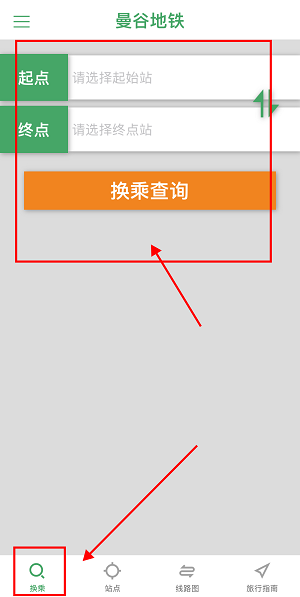1、打开曼谷地铁通app,在换乘页面输入起点站和终点站点击“换乘查询”,即可查询。