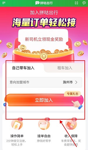 1、打开拼哒出行app,选择加入方式点击“立即加入”。