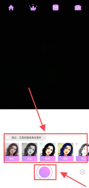 1、启动应用程序后选择相册导入或直接拍摄照片,智能系统会自动开启面部识别和风格转换。