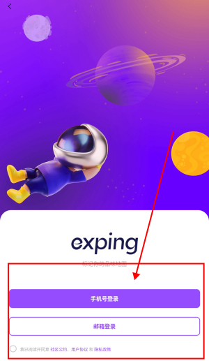 1、打开exping app,点击“同意并继续”。