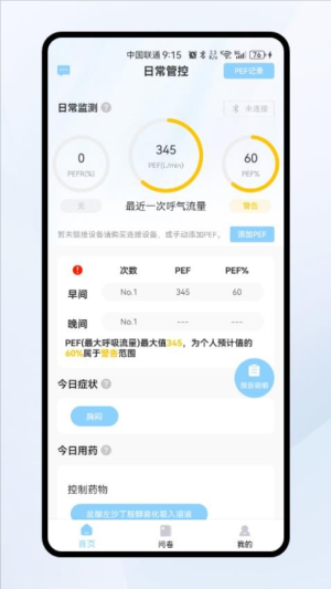 1、精准监测中心:实时显示PEF、FEV1等8项关键肺功能指标。