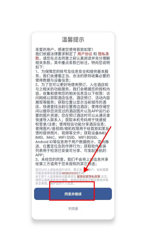 1、打开首旅如家酒店app,点击“同意并继续”。