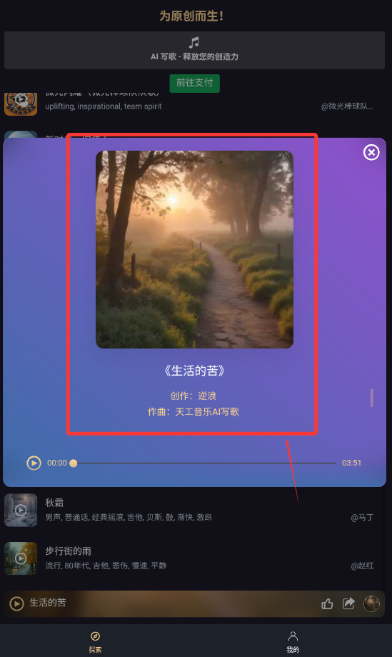 2,点击即可欣赏个人创作歌曲。