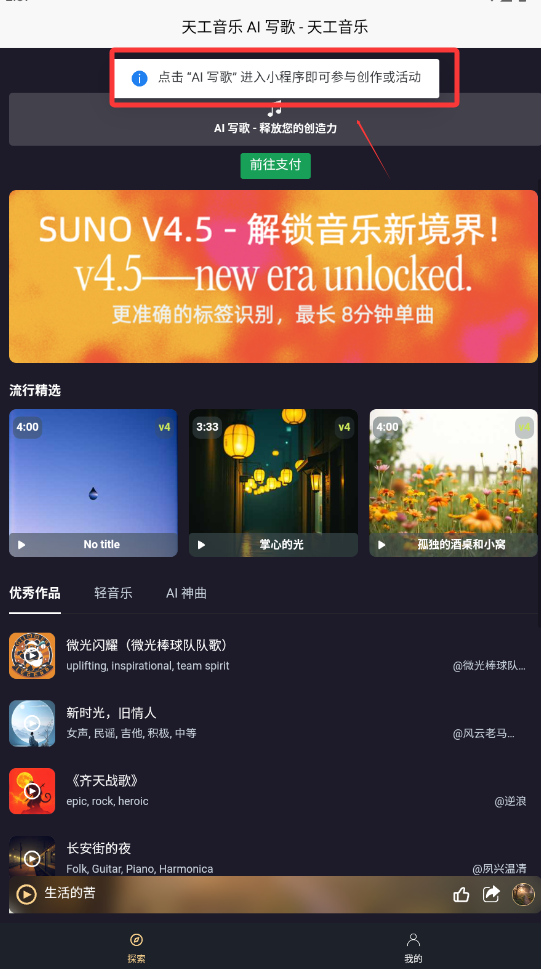 天工音乐AI写歌通过技术创新将专业音乐制作流程平民化,其智能化的交互设计与强大的定制能力,既适合新手快速入门,也能满足资深创作者的进阶需求,重新定义了数字时代的音乐生产方式。