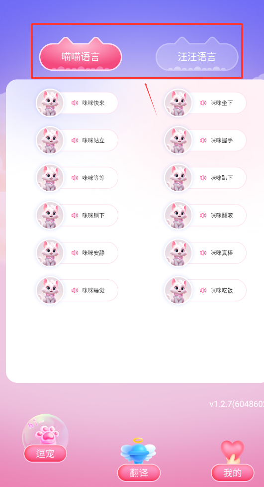 1、进入首页后可以选择宠物类别,按住语音输入需要对猫狗的话,即可沟通。
