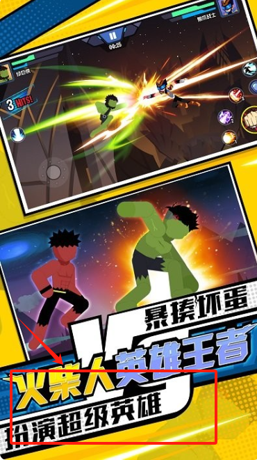 3、技能特效很炫酷,下方有两个不同颜色的火柴人,开始暴揍坏蛋吧英雄王者。