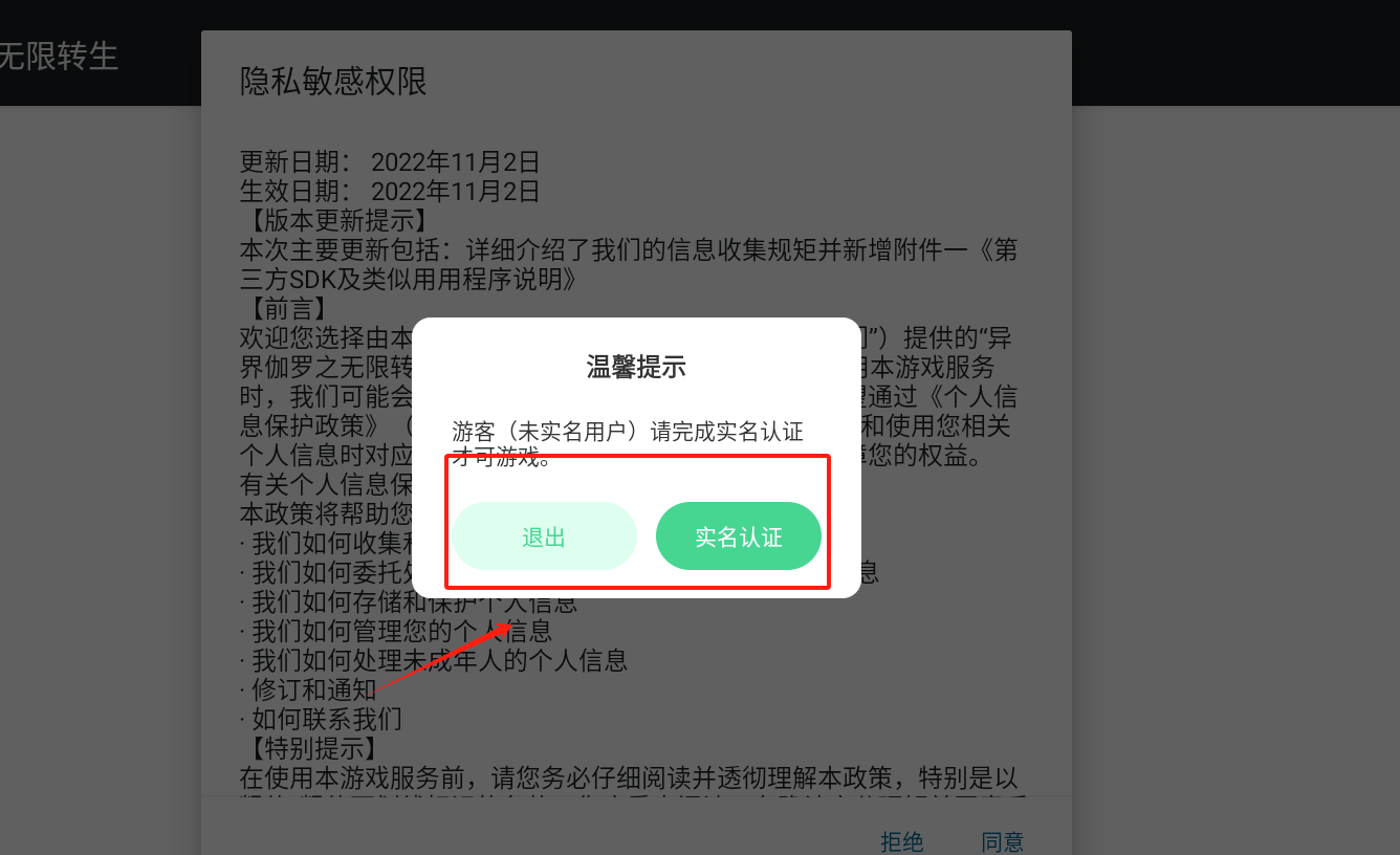 1、游戏登录时的隐私政策提示,未实名认证的玩家必须点击实名认证才能玩游戏,不认证就只能点退出。