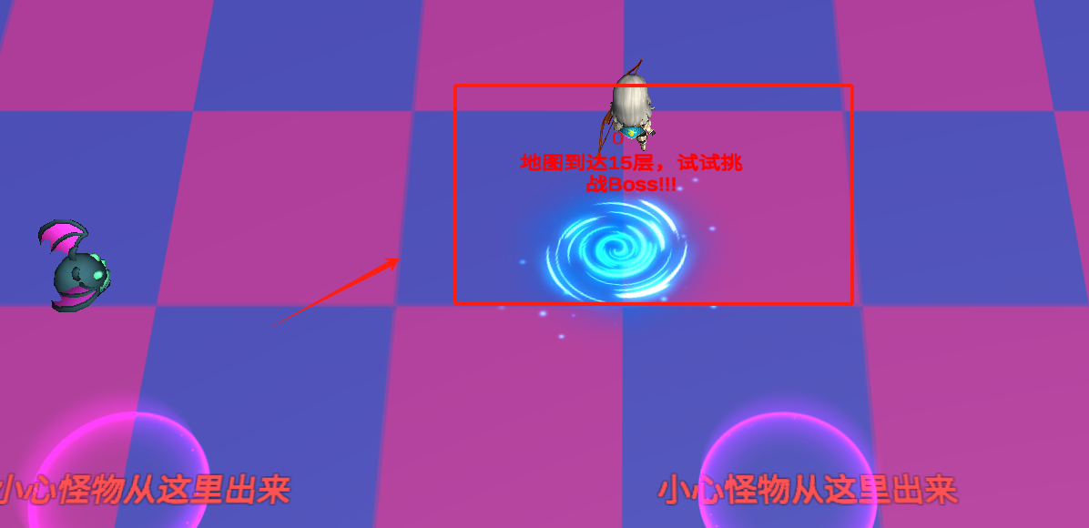 2、当前地图已到15层,屏幕中间有个蓝色漩涡Boss,左侧有粉色怪物,注意底部两侧可能刷出其他怪物。