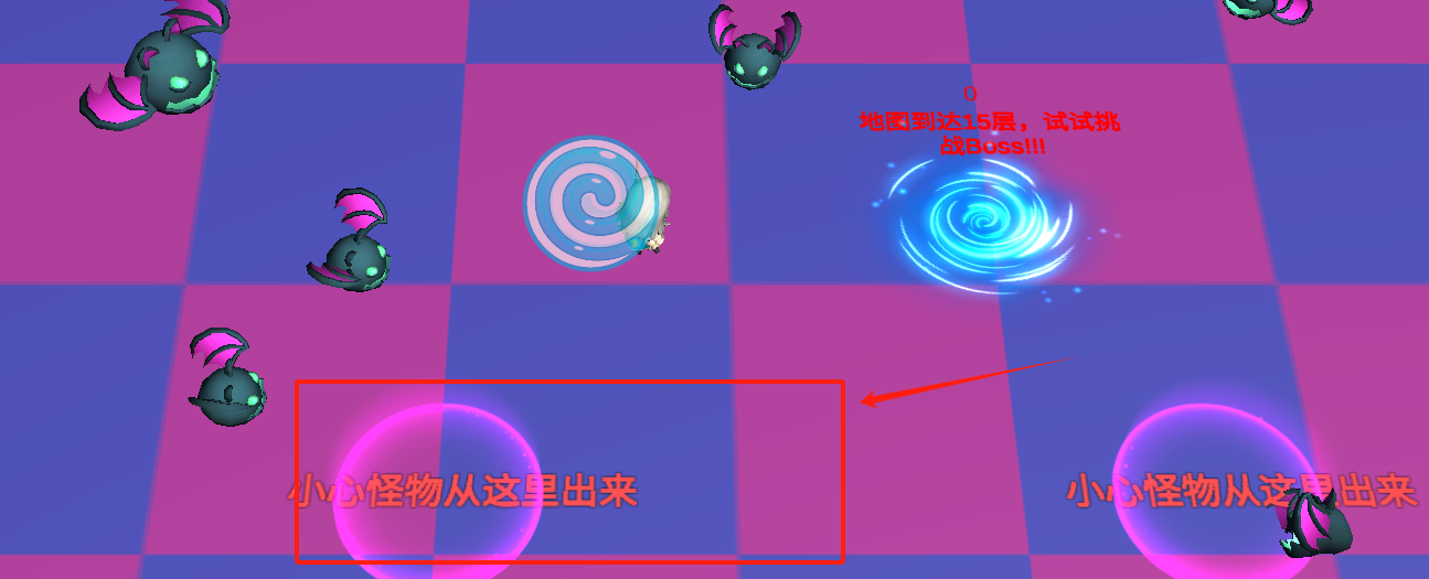 3、中央有蓝色漩涡和螺旋装置,两侧会随机出现绿色小怪,底部两侧提示怪物可能从红圈处出现。