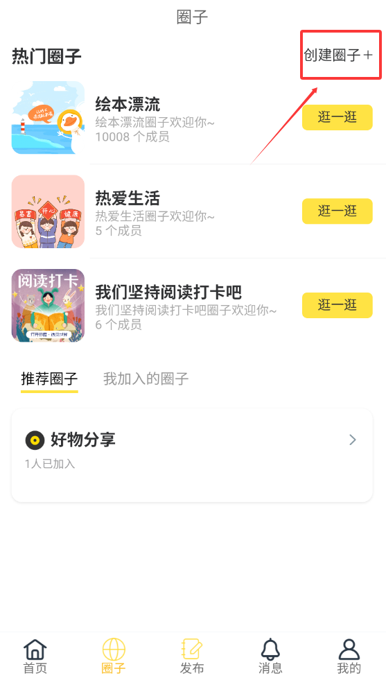 1、进入首页,可以先创建圈子,就有很多关注这个圈子的互相吸取经验。