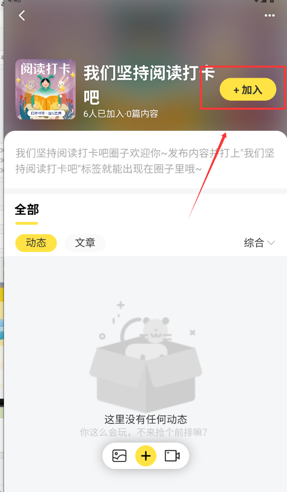 2、进入阅读打卡页面,可以加入别人的圈子,共同交流阅读经验,点击即可。