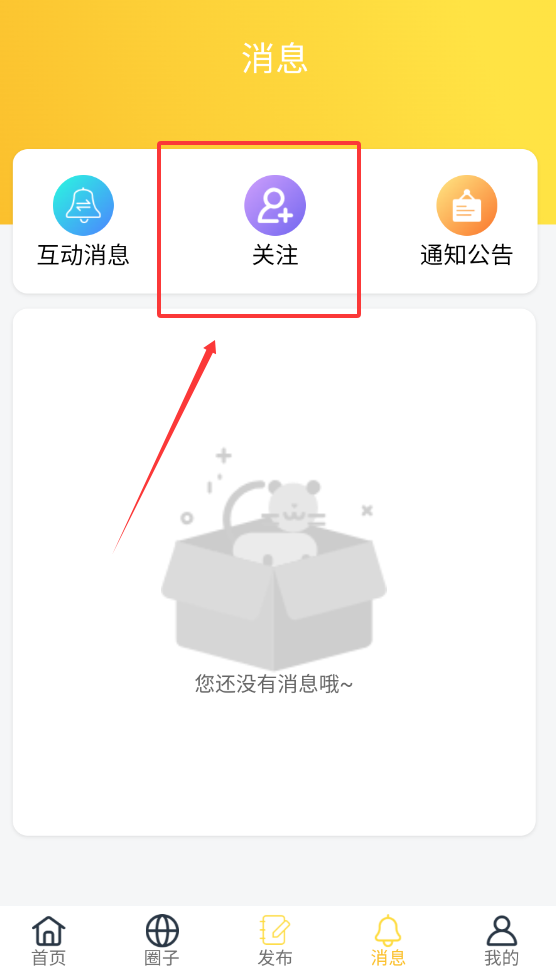 3、可以在消息内,点击进入关注内 ,查找之前添加的圈子消息。