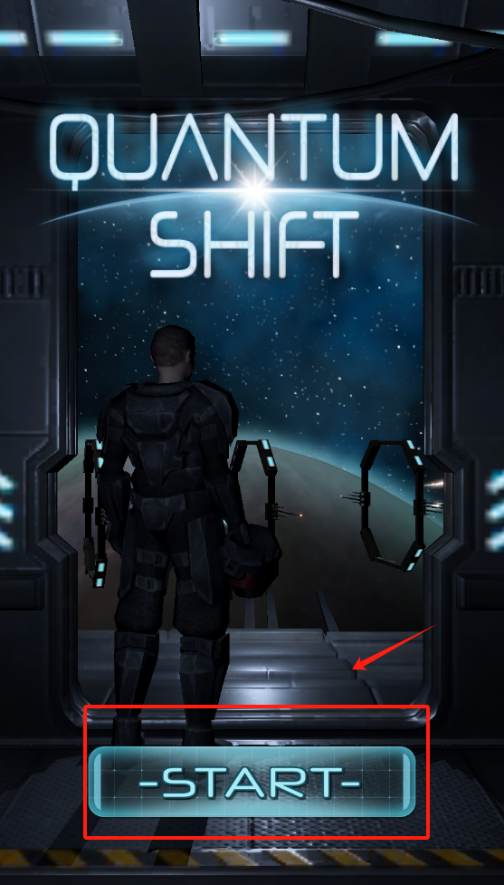 1、中间有黑色宇航员背对镜头站着拿头盔,上方发光写着QUANTUM SHIFT,下方红框标着START按钮,旁边箭头提示点击开始游戏。