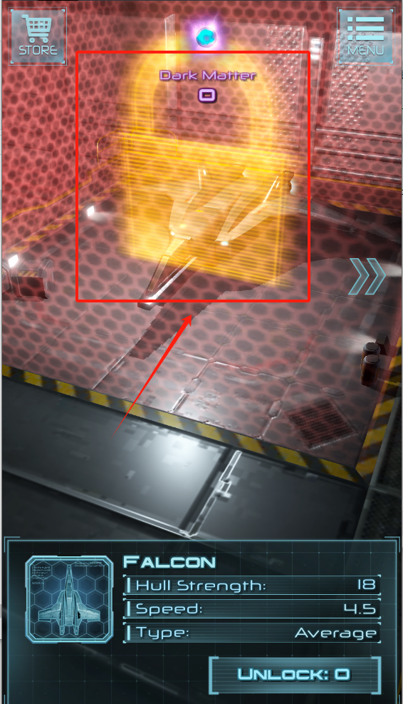 2、中间偏上有黄色发光挂锁图标,写着Dark Matter。下方显示飞船FALCON信息,船体强度18,速度4.5,类型普通,解锁数量0。