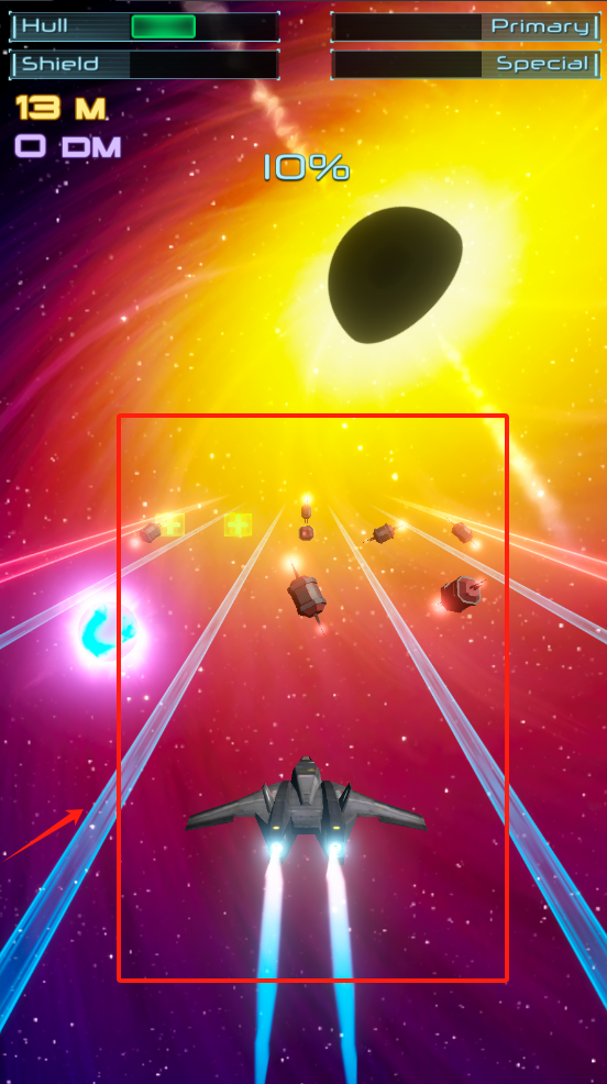 3、前方有许多方块和圆柱状敌人目标。左上角状态栏显示船体13M、护盾0DM,主武器和特殊武器数值未显示,当前状态10%。