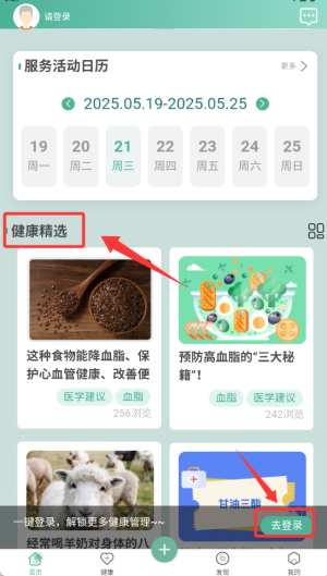 1、启动应用后,在首页选择"健康精选"功能进入登录页面。