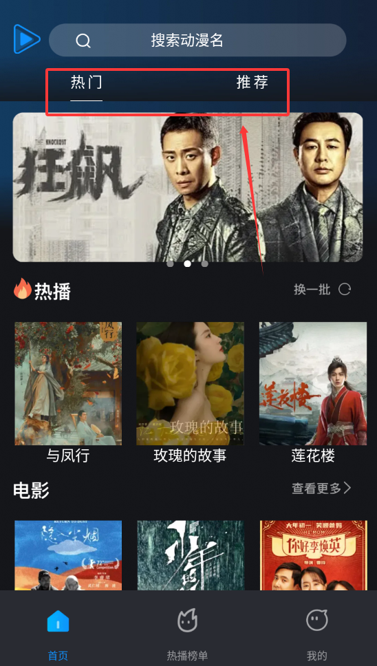1、进入首页,点击选项选择热门和推荐,即可推荐更多好剧。