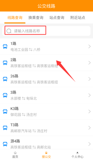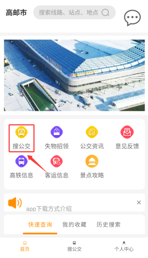 1、启动高邮E出行APP后,在首页选择"搜公交"功能,进入线路搜索界面。