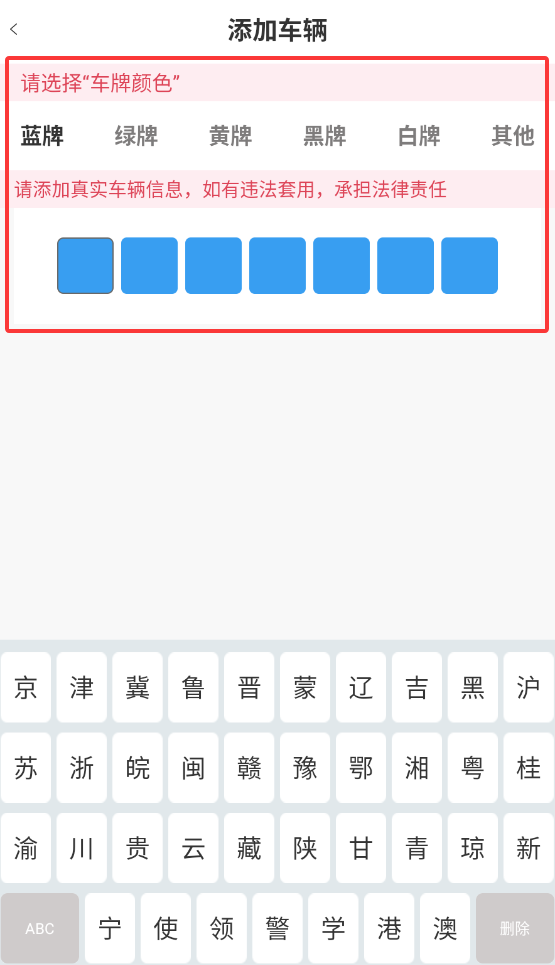 2、在车辆信息录入界面如实填写车牌号、车型等资料,系统支持同时添加多台常用车辆信息。