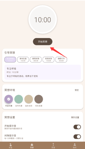 2、点击"开始冥想"按钮,系统会播放舒缓的背景音乐并引导呼吸节奏。