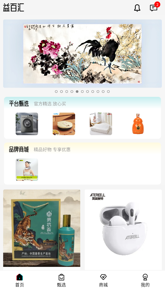 1、启动益百汇APP后,在首页底部导航栏点击"甄选"进入商品推荐页面。