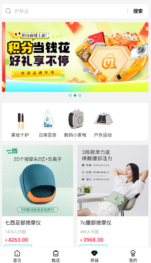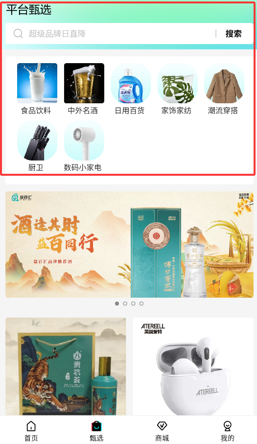 2、甄选界面展示精选商品,可按分类筛选或直接浏览选购目标商品。