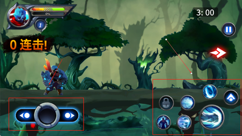 2、左侧控制角色走位闪避,右侧设置普通攻击、技能释放和跳跃按钮,合理搭配可打出流畅连击,提高战斗效率。