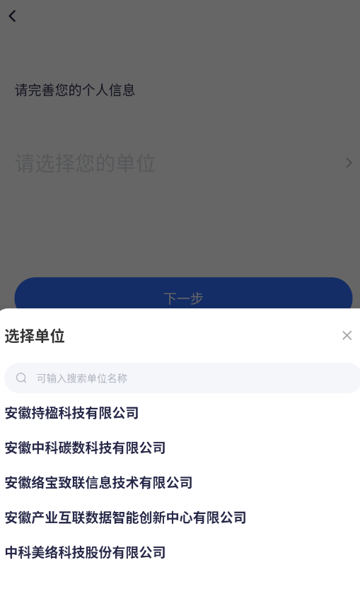 2、完成基础信息填写后,点击"选择单位"按钮进入所属机构选择界面。