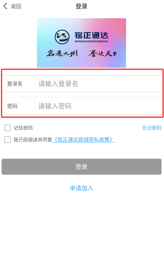 1、启动铭正通达商城APP后,在登录界面输入已注册的账号和密码完成身份验证。