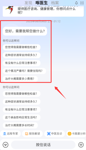 2、登录成功后选择"远程专家功能,在线描述症状并获取专业医疗建议。