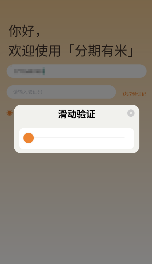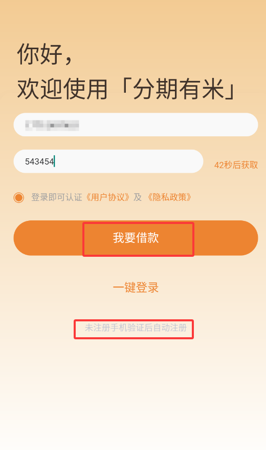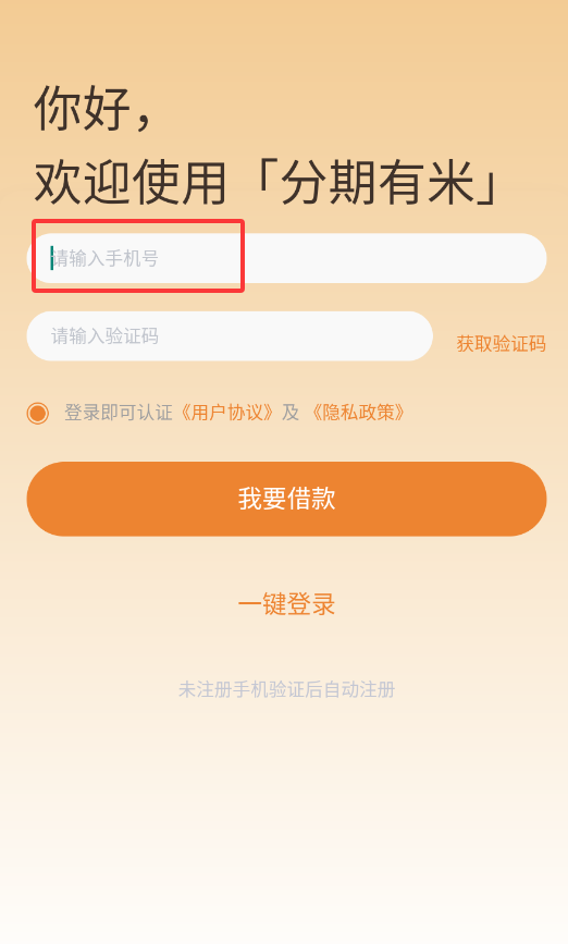 1、打开分期有米APP,进入登录界面,输入您的手机号码。