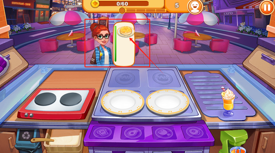 3、按箭头指示把食物端给顾客,完成60份订单能解锁新厨具。