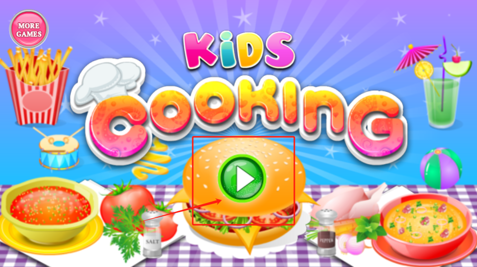 1、点绿色播放按钮开始游戏,其他MORE GAMES按钮不用管,直接进厨房。