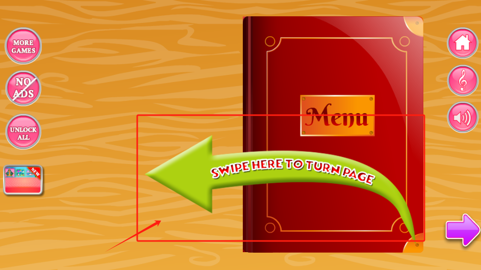 2、按绿色箭头指示向左滑动书页,可以查看菜单和更多游戏选项。