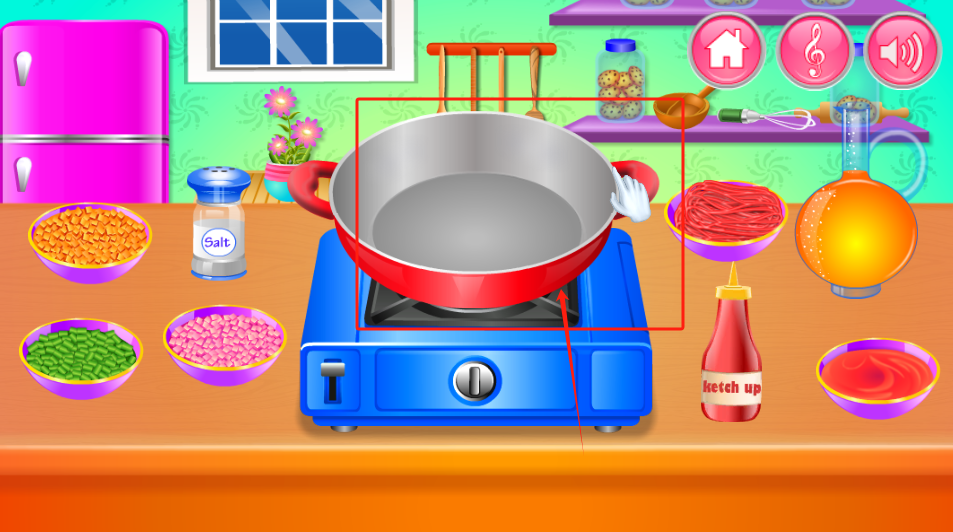 3、点炉灶开关开始煮饭,用旁边的食材做菜,盐和番茄酱可以调味。