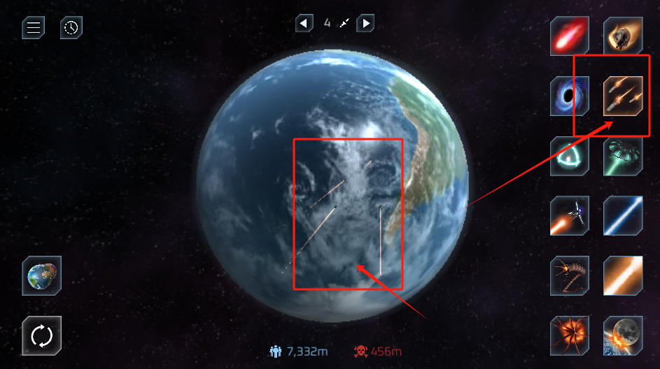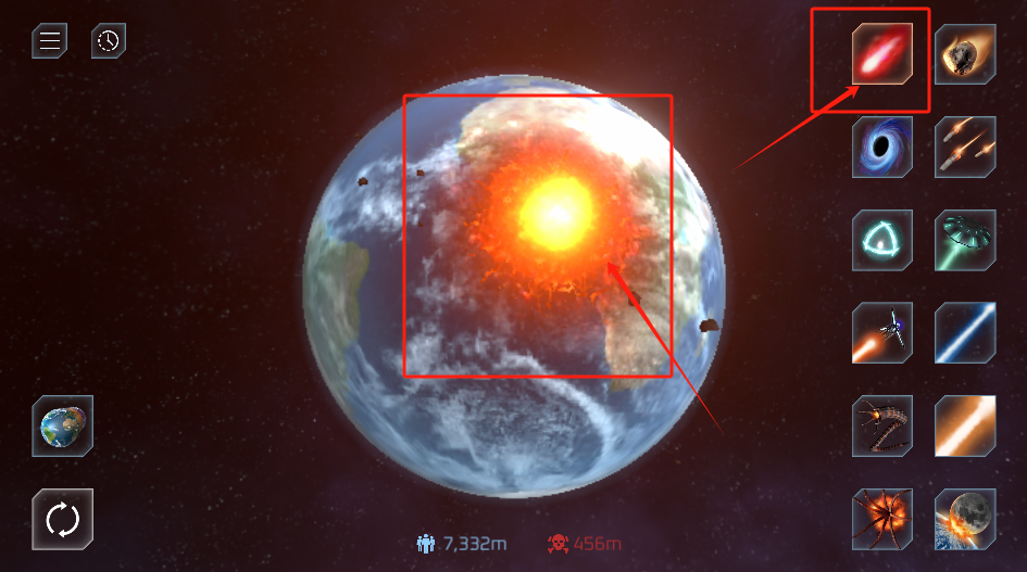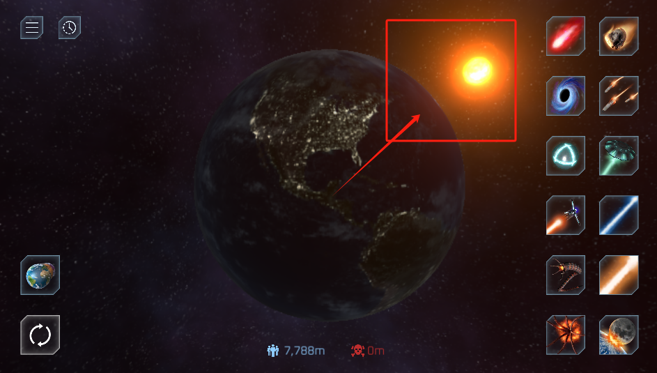 1、点右侧红框里的太阳图标,距离显示7788米,准备攻击地球。
