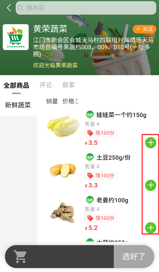 2、点击商品旁的"+"号图标,将商品加入购物车并自动计算总价。