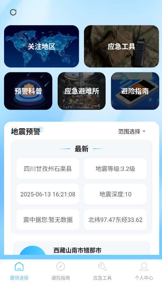 1、启动APP后,首页提供实时地震预警功能,可设置关注区域并查看周边应急避难场所分布。